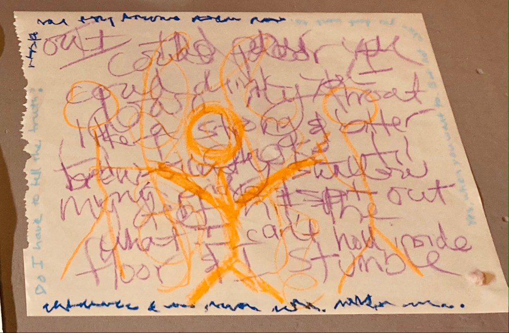 Jumping back into the river again, I found other bodies (my body?). A hand gently reached out for mine and I held it just tightly enough to convey that I wanted it to stay. Moving slowly backwards, my hind quarters met another set of hind quarters in surprise: a sacred pause of acknowledgement followed by an almost imperceptible invitation (whose?) to sway into the curves of the other, gaining speed, dropping low into the gyrations of the hips until abruptly (who first?) we walked away. Sound vibrations from across the room met my inner drums translating into recognition that this was a song for the dying so I joined the singers’ song from afar, adding my voice to the unexpected communal release. Rolling slowly over onto my back, I let my head lollop onto a neighboring belly, let it rise and fall gently with the comforting rhythm of our one breath.